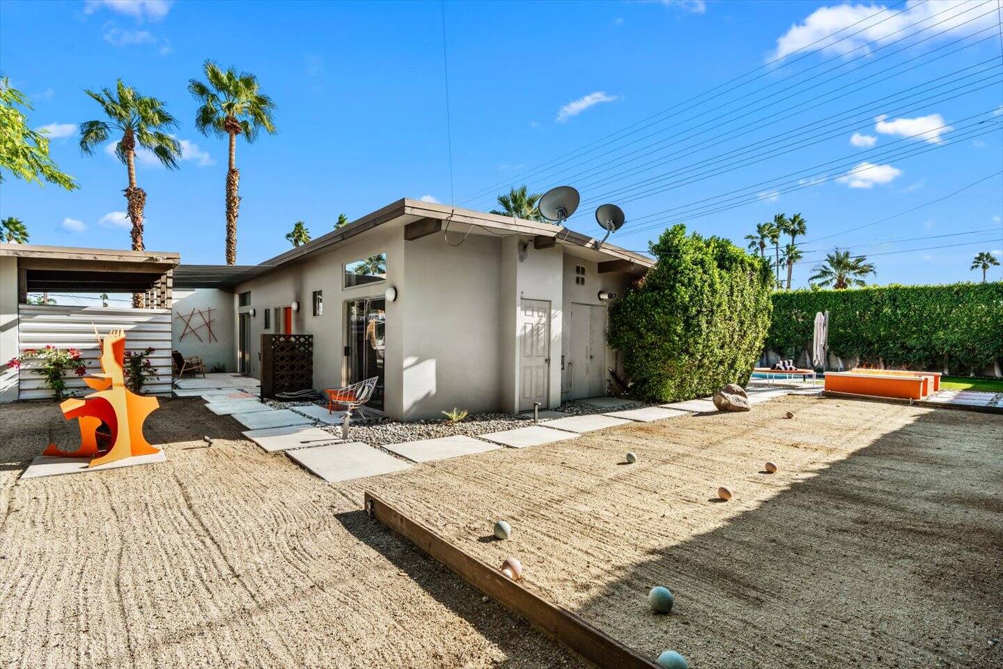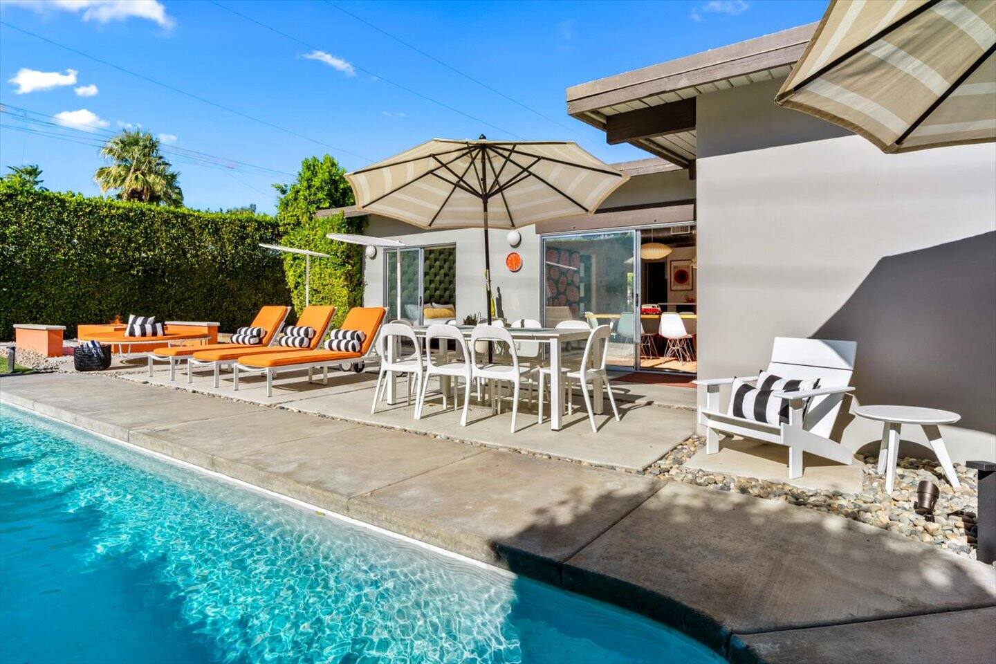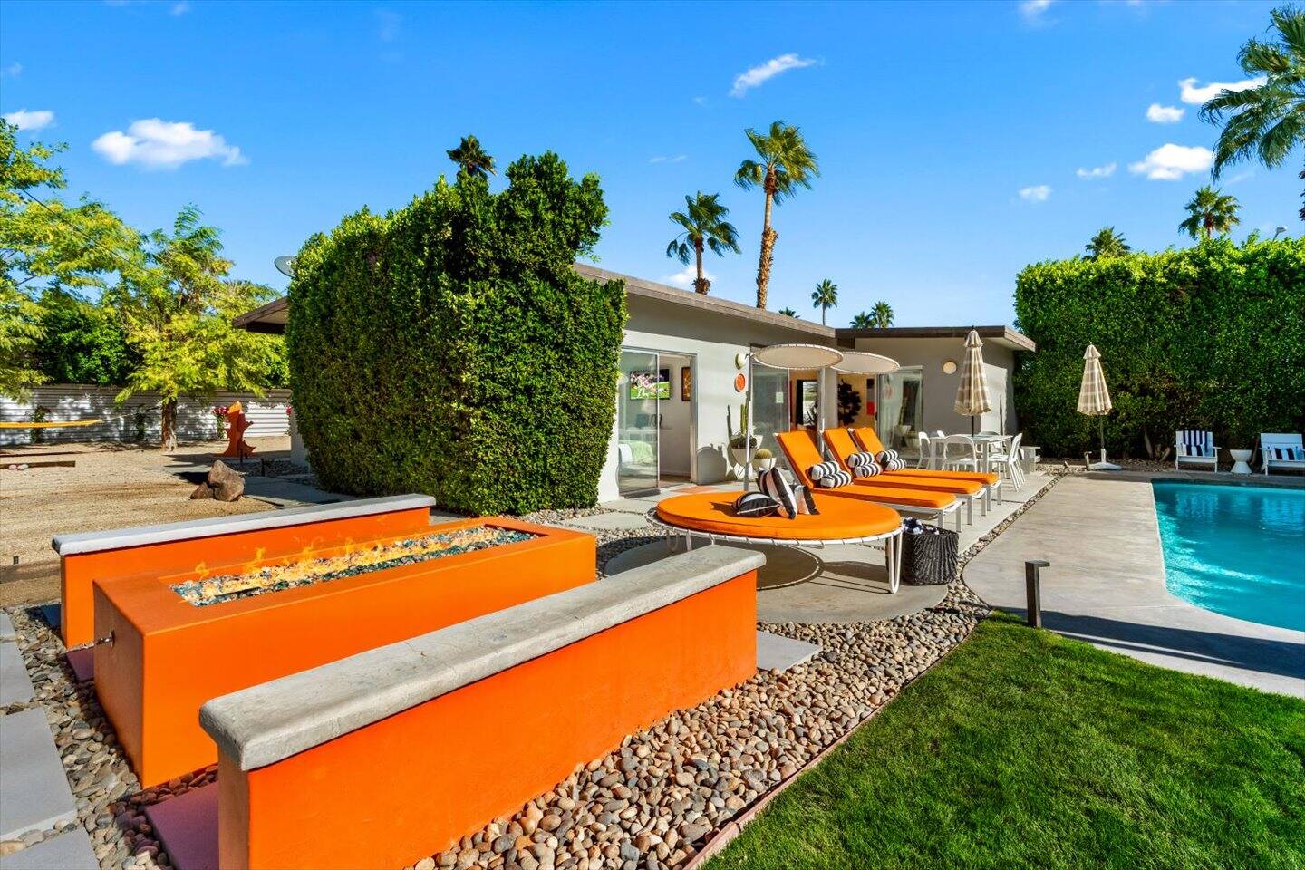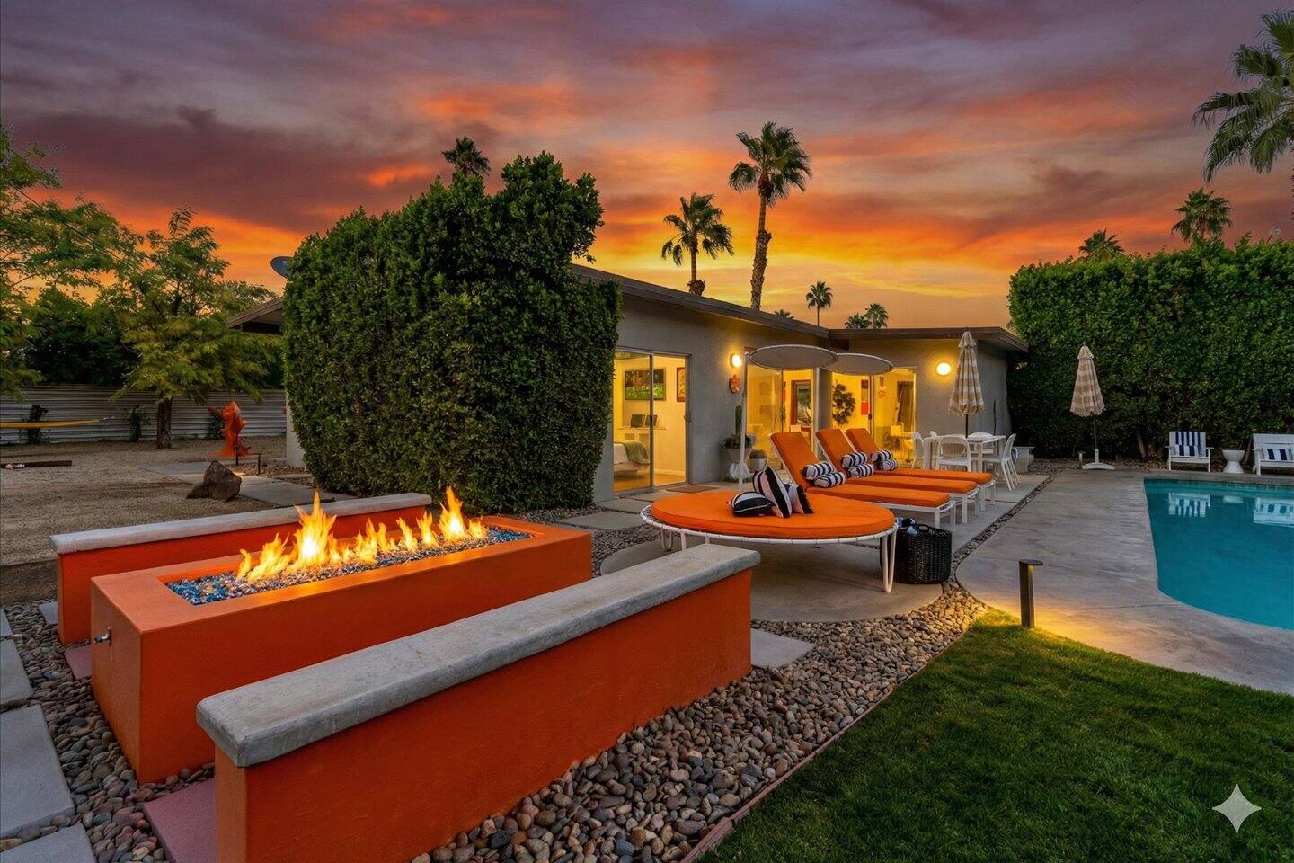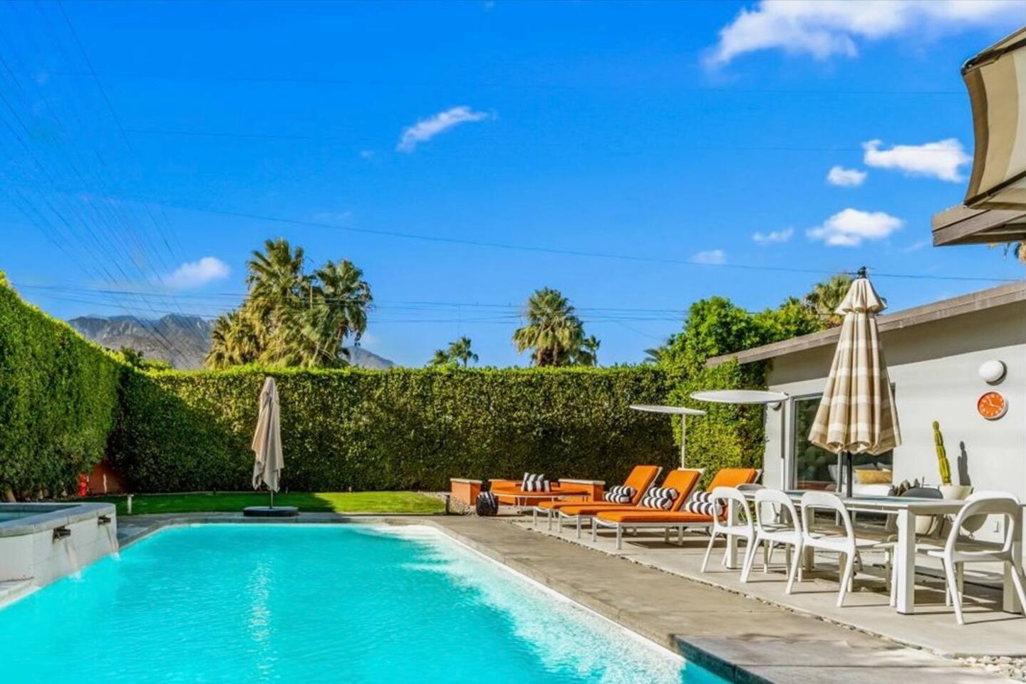 The City of Palm Springs requires an additional written contract, which will be sent to you shortly after booking. The city prohibits music and loud noise. The city strictly enforces these rules and prohibits parties, events, music, street parking, and disruptive guests. No outdoor music is allowed at any time. Quiet hours are between 9:00 pm and 10:00 am, and guests are asked to be mindful of neighbors. Overnight guests shall not exceed the property’s posted occupancy. Pets are welcome for an additional $125 per-stay pet fee. Pool Heat is an additional $100/night. Spa heat is included in the nightly rate. This home is equipped with a security camera by the front door and in the carport for your security and protection. No cameras are located in the backyard or inside the house. Service providers, such as pool cleaners and landscapers, are scheduled regularly while you're staying with us. They let themselves into the yard without notice.